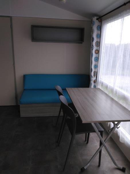 À l’intérieur, vous découvrirez un séjour très lumineux, aménagé avec une table et des chaises, parfait pour partager des moments de détente ou des repas en famille.